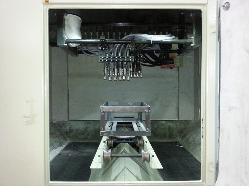 該設(shè)備是根據(jù)不銹鋼水槽產(chǎn)品特性而專門(mén)設(shè)計(jì)的(非標(biāo)準(zhǔn)型)轉(zhuǎn)動(dòng)式自動(dòng)噴砂機(jī),完全適合購(gòu)方所提供的產(chǎn)品。根據(jù)購(gòu)方對(duì)產(chǎn)品效率的要求,設(shè)備采用轉(zhuǎn)動(dòng)推車式噴砂機(jī)。